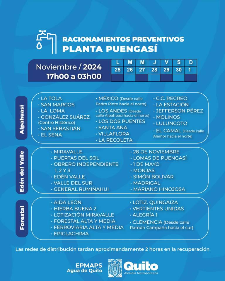 Se suspenderá el servicio en 95 de los 1.280 barrios del Distrito Metropolitano de Quito, aplicando horarios específicos.