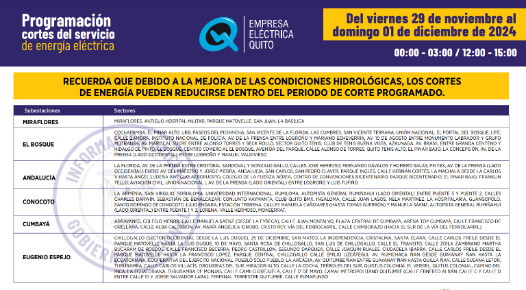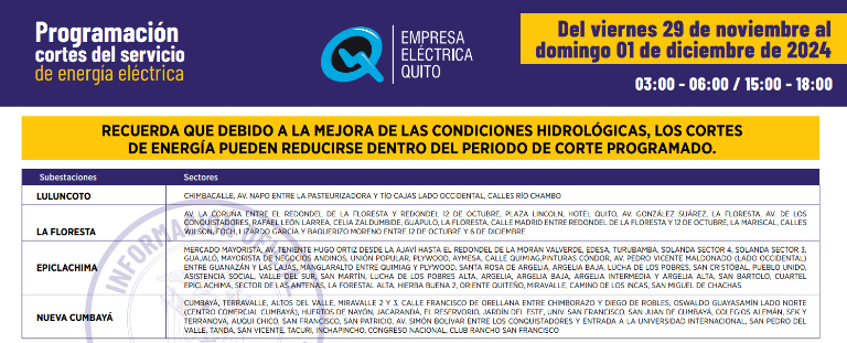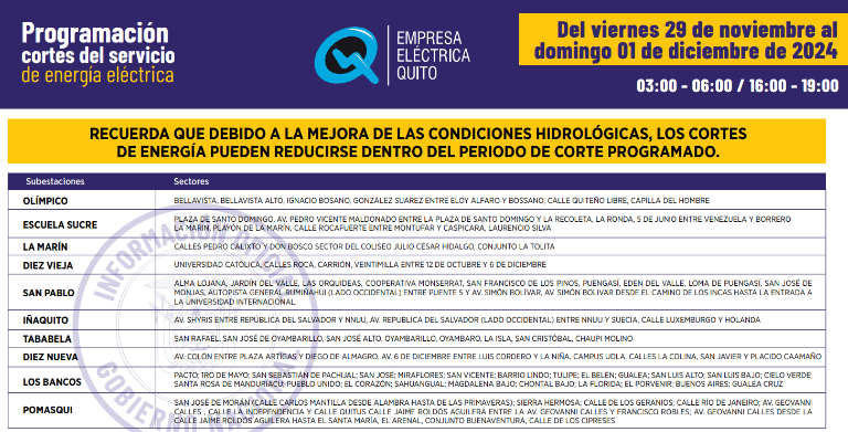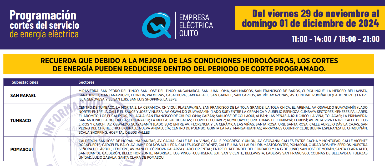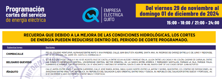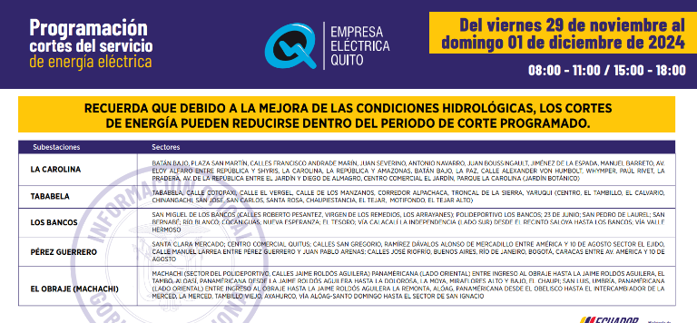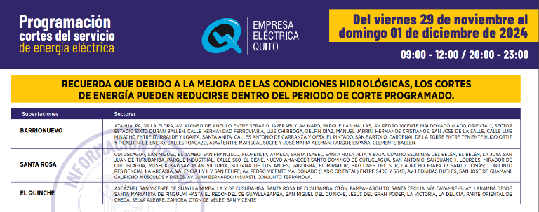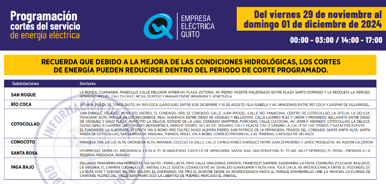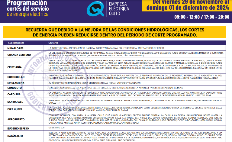 Quito continuará con los cortes de electricidad de hasta siete horas para este viernes 29 de noviembre. El cronograma fue publicado por la Empresa Eléctrica Quito.