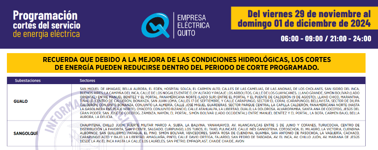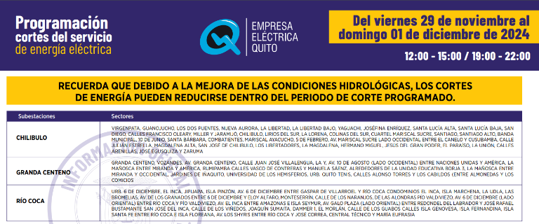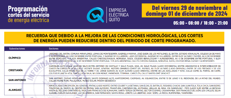 A continuación puede consultar los horarios de los racionamientos programados en Quito: