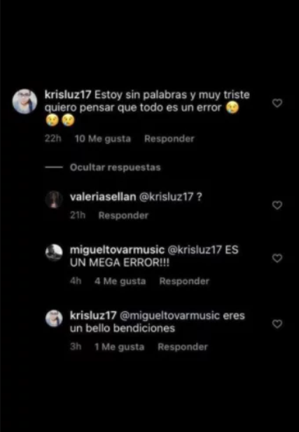 En sus redes sociales una de sus seguidoras señaló su asombro por la situación: “Estoy sin palabras y muy triste, quiero pensar que todo esto es un error”. Por lo que Tovar reaccionó en su cuenta de Instagram diciendo: “Es un mega error”.