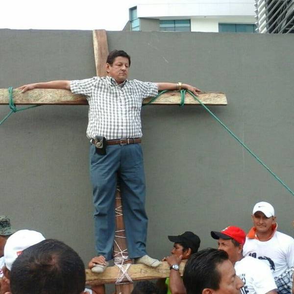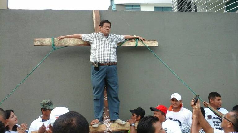 El alcalde de Balzar, Cirilo González, decidió atarse a una cruz en protesta de una posible destitución. El hecho ocurrió este miércoles 6 de julio en los exteriores de la Contraloría General del Estado, en Guayaquil.