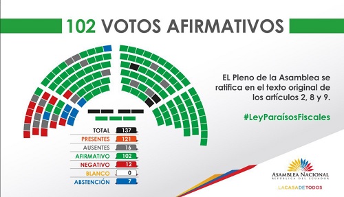 Con 102 votos afirmativos, la Asamblea Nacional se ratificó este jueves 24 de agosto en el texto original de los artículos 2, 8 y 9 del proyecto de Ley Orgánica, para la aplicación de la Consulta Popular efectuada el 19 de febrero del 2017, también llamado Ley de Paraísos Fiscales.