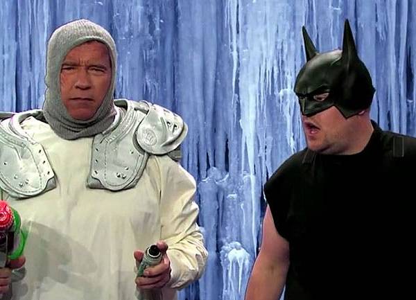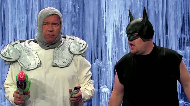 En menos de seis minutos, junto a Corden, Schwarzenegger hace un repaso por personajes de películas, empezando con Conan el Bárbaro, y siguiendo con otros míticos filmes como Comando, Desafío Total, Perseguido, y hasta Batman & Robin.