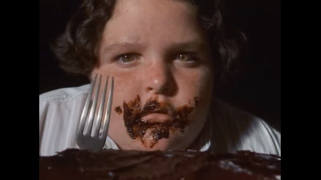 Bruce Bogtrotter, el niño chubby, se come un enorme pastel de chocolate por mandato de la terrible directora Tronchatoro.