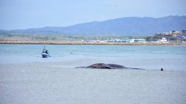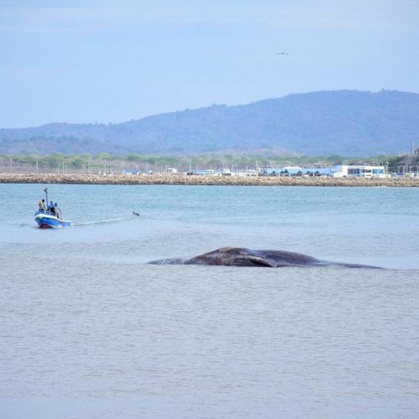 Una ballena azul permanece varada aún con vida en la playa de la comuna El Real, de la parroquia Chanduy en la provincia de Santa Elena, informa Diario El Universo.
