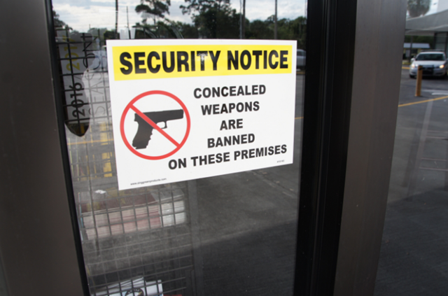 Bajo el rótulo se ve otro que reza "Aviso de seguridad: Ninguna arma oculta está permitida en estas instalaciones".
