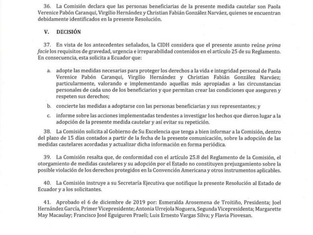La Comisión Interamericana de Derechos Humanos (CIDH) instó a la justicia ecuatoriana a otorgar medidas cautelares a favor de la prefecta de Pichincha, Paola Pabón; del exasambleísta de la Revolución Ciudadana, Virgilio Hernández; y para el colaborador de la Prefectura, Christian González. Los tres permanecen detenidos por el delito de rebelión.