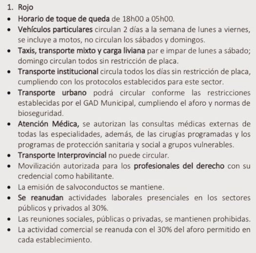 Dentro de la estrategia del "semáforo epidemiológico", el sistema de desescalada impulsado por el Gobierno, se realizaron cambios en los colores amarillo y rojo. En el caso de Quito se mantienen las restricciones y se refuerzan los controles.