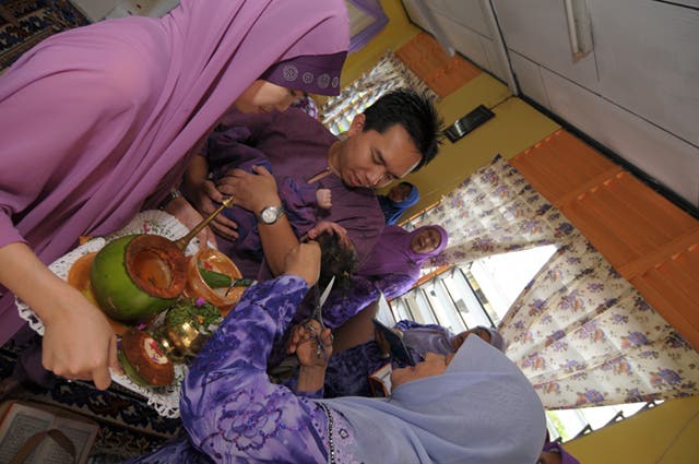Las mujeres malayas lavan la cabeza de su recién nacido afeitado en un baño de limas kafir. Se dice que la manera en que los cabellos caen al agua indica cómo sería el comportamiento del niño.