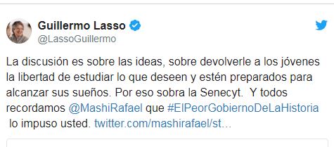 "Los jóvenes ecuatorianos ya no quieren que los políticos del pasado decidan por ellos. Ud. @MashiRafael les truncó sus sueños y el presidente @Lenin que Ud. nos impuso los dejó sin empleo. Yo por el contrario los ayudaré a emprender para que recuperen la esperanza y tengan futuro", respondió Lasso a Correa, quien no se quedó callado y publicó el siguiente mensaje: