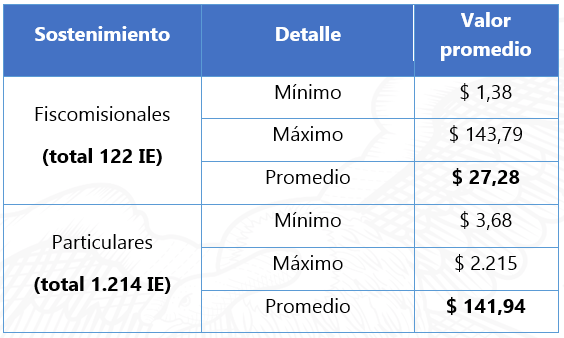 De acuerdo a cifras del Ministerio de Educación, el valor de las pensiones en el régimen Sierra-Amazonía en instituciones particulares y fiscomisionales, oscila entre $ 1.38 como mínimo, hasta $ 2.215 como máximo.