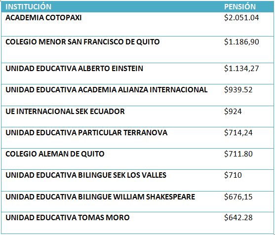 En base a un listado de la Subsecretaría de Apoyo, Seguimiento y Regulación de la Educación sobre los valores aprobados para la pensión y matrícula 2018-2019, con información aportada por las instituciones educativas, Vistazo extrajo diez de los colegios con el valor de la pensión más alto en Quito.