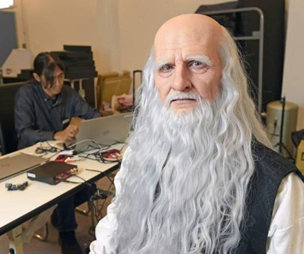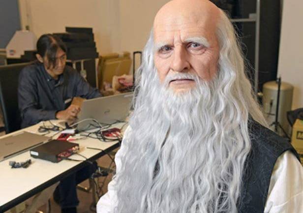 El aspecto del Da Vinci robótico, con larga barba blanca, cejas pobladas y piel artificial, se corresponde a cómo debía ser el científico en sus últimos días, y gracias a la tecnología aplicada a la mímica facial,
