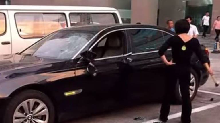 ciudad de Shenzen (China), curiosos peatones grabaron en sus teléfonos el momento en que una mujer arremetió contra un auto de lujo por celos.