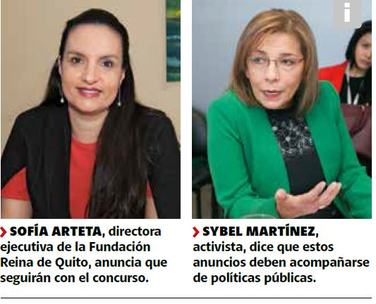 Ella también considera que es un ejemplo a seguir la iniciativa de los municipios que están retirando los fondos para los certámenes. No obstante, considera que las mujeres son libres para organizar y participar en concursos de belleza, ya que van modificando las miradas de la mujer conforme se avanza en derechos: “El hecho de que la actual reina de Guayaquil esté embarazada y el Municipio anuncie que eso no representa un problema, es un avance”.