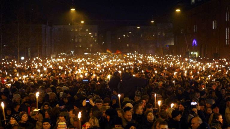 "No están solos, un ataque a los judíos daneses es un ataque a Dinamarca", dijo la primera ministra en referencia al tiroteo en la sinagoga de Copenhague en el que murió un joven, arrancando los primeros aplausos en la multitud, que creaba un mar de luz con las antorchas repartidas por la organización.
