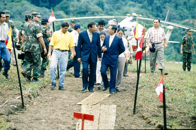 Fujimori y Mahuad recorriendo el área de conflicto donde operó la Momep, tropas de los países garantes, para evitar nuevas escaramuzas.