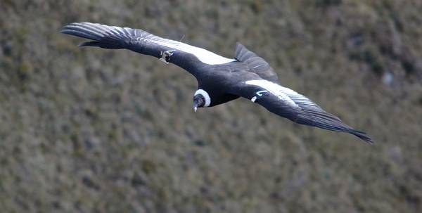 Con un plumaje negro-azulado, una ancha banda blanca en el dorso de las alas y un collar blanco en su cuello, el cóndor, conocido también como el "rey de las alturas", puede elevar su vuelo hasta unos 6.000 metros sobre el nivel del mar.