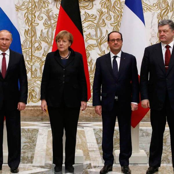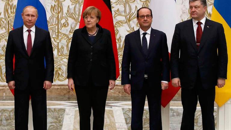 En Minsk, tras una maratoniana cumbre de 15 horas, el presidente ucraniano, Petró Poroshenko, y el ruso, Vladímir Putin, junto con el francés, Francois Hollande, y la canciller alemana, Angela Merkel, consiguieron consensuar un documento por el que entrará en vigor un alto el fuego en el este de ucrania a partir del domingo. EFE