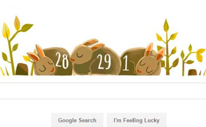 En la página principal del motor de búsqueda pueden apreciar a dos conejos durmiendo. Uno tiene dibujado el número 28 (en referencia al último día de febrero) y otro con el 1 (por el primer día de marzo). Sin embargo, un tercero aparece en escena, con el número 29, y se hace lugar entre los dos.