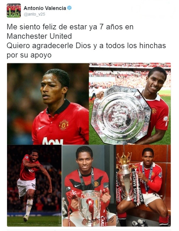 "Me siento feliz de estar ya 7 años en Manchester United. Quiero agradecerle Dios y a todos los hinchas por su apoyo", fue la respuesta del medicocampista ecuatoriano.