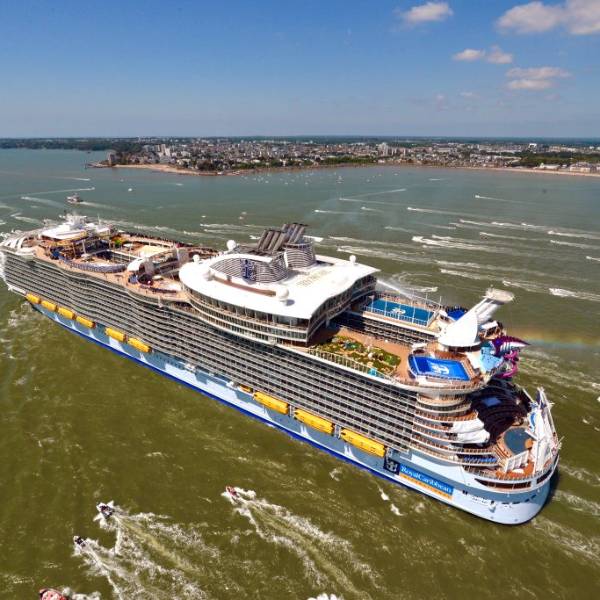 Este enorme barco de 362 metros de eslora, 66 de manga y 72 de altura desde la línea de flotación -el equivalente de un edificio de 20 pisos- partió ayudado por dos remolcadores, espectáculo seguido desde la costa por unas 70.000 personas, según el ayuntamiento, pero también desde el mar por decenas de embarcaciones y desde el aire.