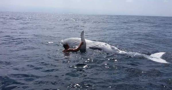 Sin embargo, la naturaleza los sorprendió al encontrar a un ballenato enredado en artes de pesca. Aún con un poco de miedo, Ernesto se lanzó al agua, con un cuchillo en mano, para liberar de las redes al cetáceo.
