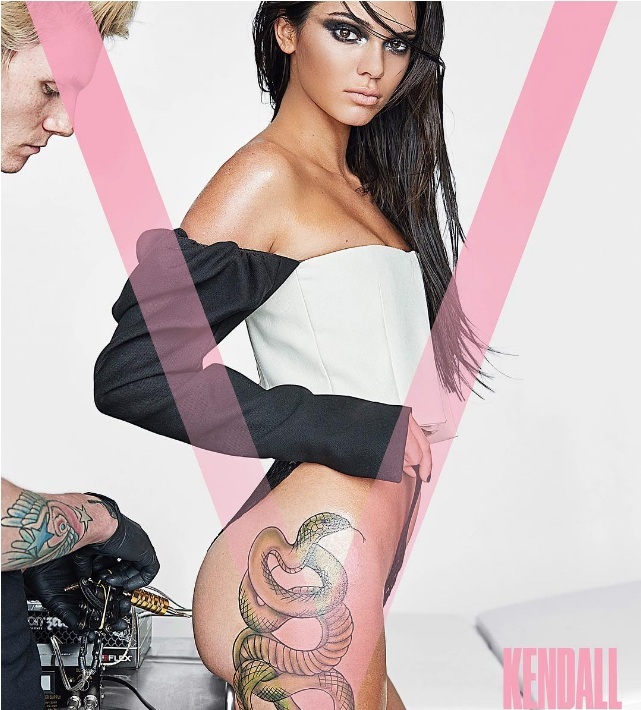 Kendall Jenner se tatuó una gran serpiente en color verde en el costado de de su pierna derecha, para la portada de la revista V Magazine, que se publicará el 12 de enero.