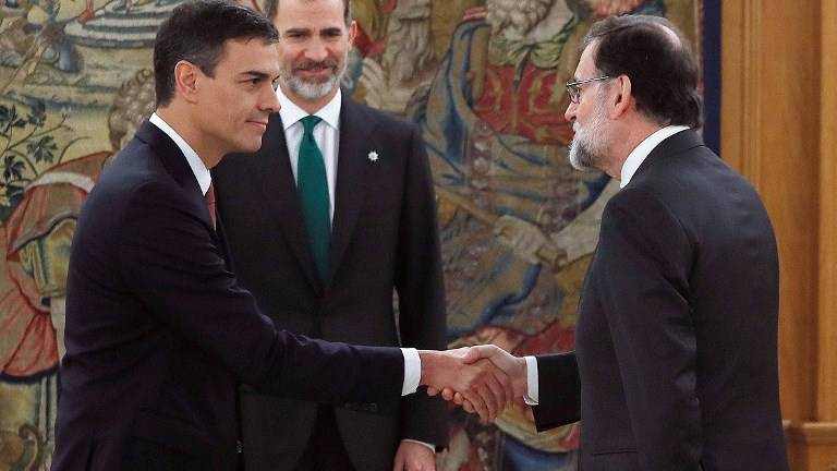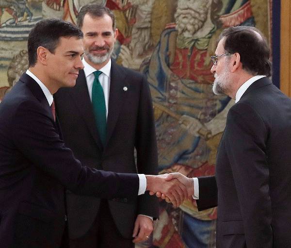 Su llegada oficial al Palacio de la Moncloa ocurre 24 horas después de que el Congreso de los Diputados aprobara la moción de censura presentada por los socialistas contra Rajoy, cuyo Partido Popular fue condenado por la justicia en un megaescándalo de corrupción.