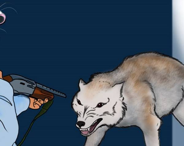 En su versión reeditada de "Caperucita Roja", la pequeña heroína parte hacia la casa de su abuelita por el bosque con su arma en el hombro y finalmente logra asustar al lobo.