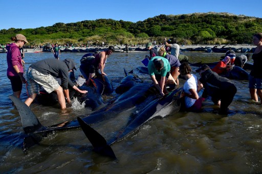 La víspera, 416 ballenas piloto fueron halladas en la playa de Farewell Spit en la región de Golden Bay, en el norte de South Island, una de las principales islas de Nueva Zelanda.