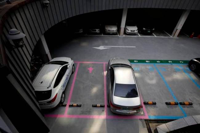 Espacios de parqueo solo para mujeres, delimitados por una línea verde y de color rosa y morado, se establecieron en un centro comercial de Shanghái.