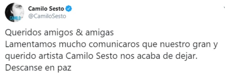 "Lamentamos mucho comunicaros que nuestro gran y querido artista Camilo Sesto nos acaba de dejar", reza el mensaje.