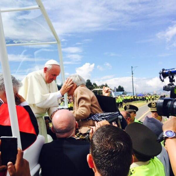 elevar a la anciana en su silla de ruedas hasta Francisco, quien la recibió con una sonrisa, le dio un beso en la frente, la bendijo y le dijo unas palabras.