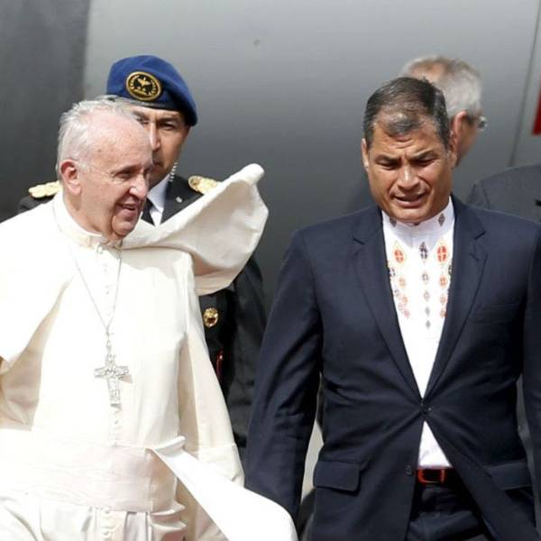 Posteriormente, Rafael Correa y Jorge Mario Bergoglio se dirigieron a un estrado preparado en el aeropuerto, desde donde dieron sendos discursos.