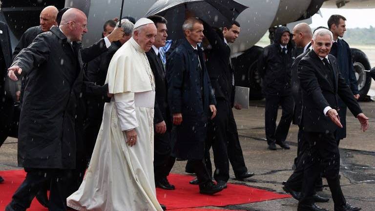 El papa Francisco llegó este viernes bajo la lluvia a Paraguay, país donde concluirá el domingo su intensa gira por sudamericana luego de visitar Ecuador y Bolivia.