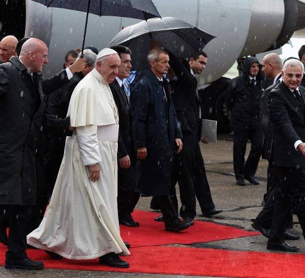 Esperado por el presidente Horacio Cartes, Francisco descendió del avión bajo un aguacero sin protegerse por un paraguas hasta que estrechó las manos de las autoridades paraguayas.