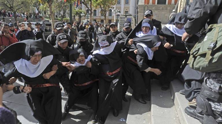Activistas del grupo feminista boliviano Mujeres Creando se disfrazaron hoy de monjas embarazadas para protestar en las puertas de la catedral de La Paz contra la visita del papa Francisco que comenzará el miércoles, informaron hoy los medios.