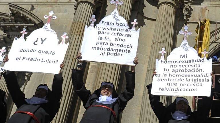 "¿Y dónde quedó el Estado laico?", "Francisco tu visita no es para reforzar el poder, sino para bendecir mañudamente (mañosamente) el poder" y "la Iglesia lucra contra la salvación y no paga impuestos como nos obligan a ti y a mí" fueron algunos de los mensajes expuestos a los medios.