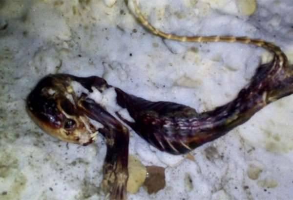 Las imágenes muestran el cuerpo de una criatura de cola larga y colmillos grandes, cuyas patas delanteras están unidas.
