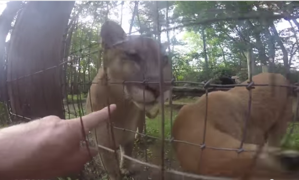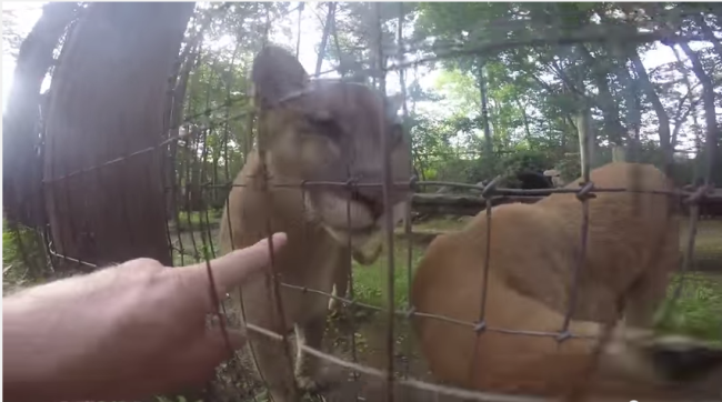 El video muestra cómo Joshua Newell, de 35 años, salta una cerca para luego acaricia a dos pumas a través de una reja, mientras les dice "kitty, kitty, kitty", el apodo usado en inglés para llamar a los gatos.