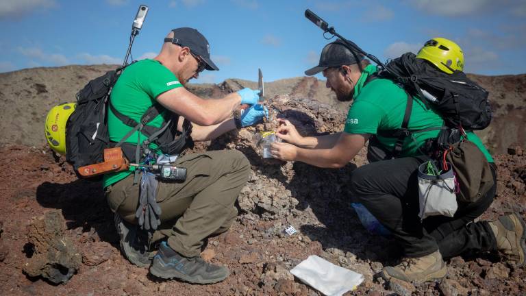 De rodillas ante un profundo cráter, el astronauta Alexander Gerst recoge una muestra de roca volcánica, que guarda celosamente en una bolsa plástica. Aunque parezca, no está en la Luna, sino en el Parque Natural de Los Volcanes en la isla española de Lanzarote.