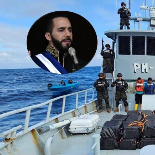 La Marina Nacional, en un operativo reciente, interceptó una lancha a 805 millas náuticas (1,491 kilómetros) al suroeste de la Bocana El Cordoncillo, Estero de Jaltepeque. "Once días después de otra gran incautación de droga", enfatizó Bukele en un mensaje compartido en la red social X.