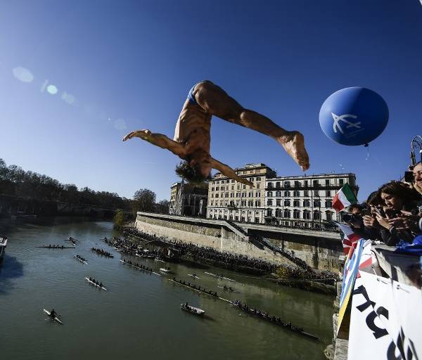 Como cada año, algunos valientes en bañador se lanzaron al agua del Tíber, cuya temperatura no superaba los seis grados, desde un puente en el centro de la capital italiana al mediodía, bajo un sol resplandeciente.