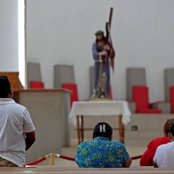 Las imágenes de fieles juntos en un templo se repiten un poco más al sur: Una mujer con tapabocas toca una imagen de Jesucristo cargando una cruz. Un hombre, que cubre su rostro con mascarilla y con su mirada perdida, sostiene un rosario. Otros tres, de rodillas, rezan y oran frente a la imagen de Cristo crucificado, mientras una mujer enciende veladoras para pedir a Dios por el fin de la pandemia del coronavirus.