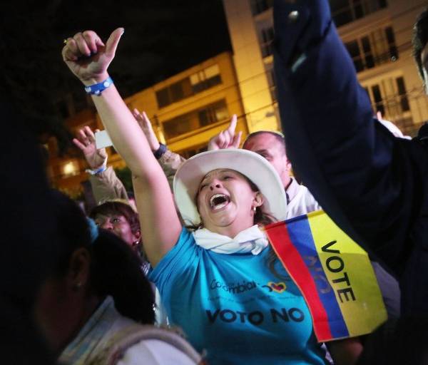 Con 99,98% de las mesas escrutadas y 37,43% de participación en el plebiscito del domingo, 50,21% de los votantes dijeron "No" y 49,78% optaron por el "Sí" al acuerdo de paz acordado entre las Fuerzas Armadas Revolucionarias de Colombia (FARC, marxistas) y el gobierno de Santos, tras casi cuatro años de negociaciones en Cuba.