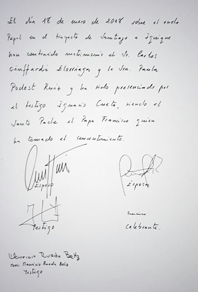 "Celebrante: Francisco", se lee en el acta de matrimonio histórica y que está firmada por ambos esposos, por Cueto y por Mauricio Rueda, el organizador de los viajes papales y que esta vez ejerció como testigo de bodas.