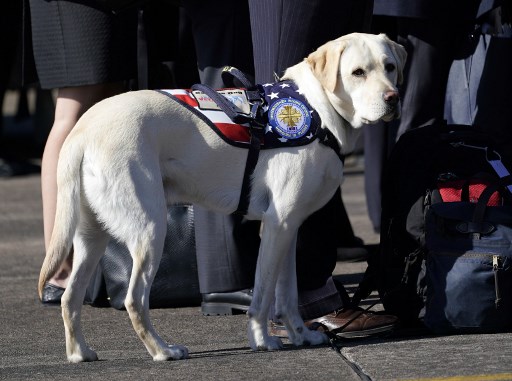Con un arnés con los colores de la bandera estadounidense, el labrador amarillo estaba en la pista de Houston, Texas, para acompañar el ataúd de su amo a bordo del avión presidencial, Air Force One, prestado por Donald Trump.