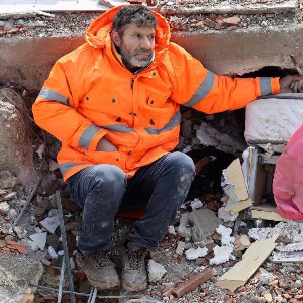 Onur Kayai, de 40 años, camina frente a su edificio en ruinas, suplicando ayuda para su madre y su hermano. Con sus propias manos ha intentado varias veces liberarlos.