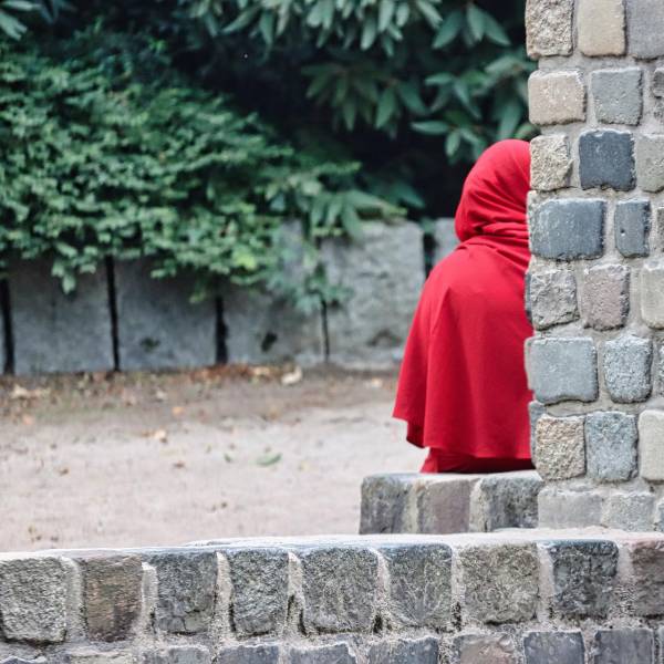 La misma maestra, de la que solo se ven las piernas, parece luego pisar sobre las alfombrillas y cerca de las manos de uno de los chicos que practicaba sus oraciones islámicas.